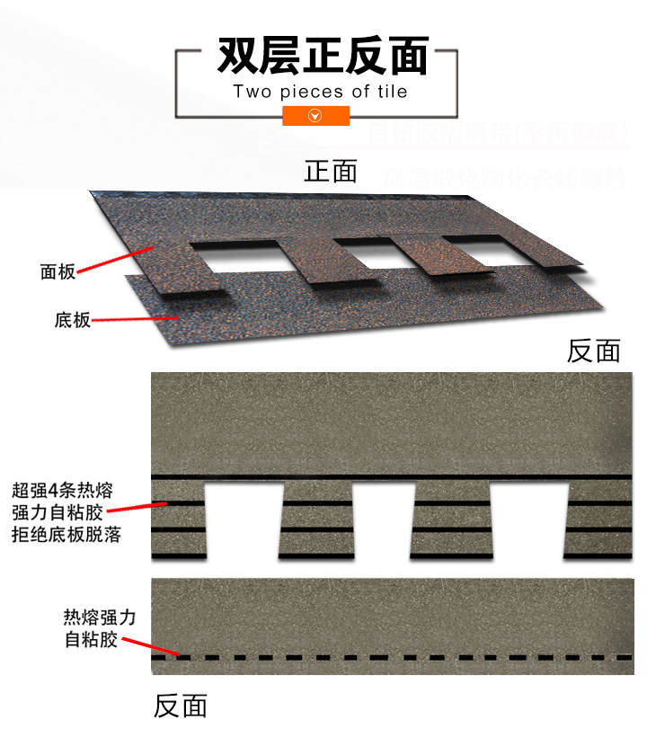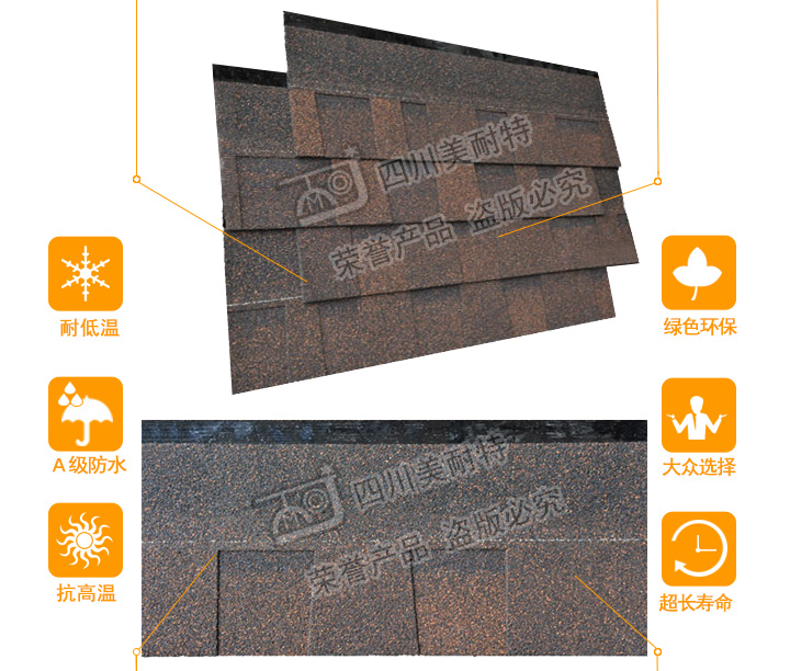 本款产品颜色丰富,一般适用于广泛应用于高档别墅、高档小区等工程,产品可自由裁剪,能成功覆盖于不同形状和不同基层的屋顶。适用屋面坡度从15°到90°不同建筑。