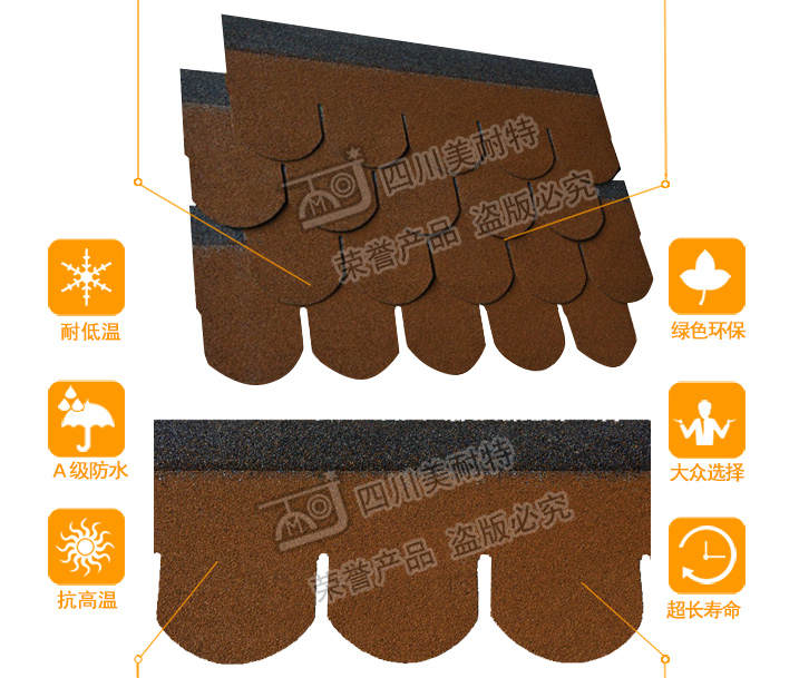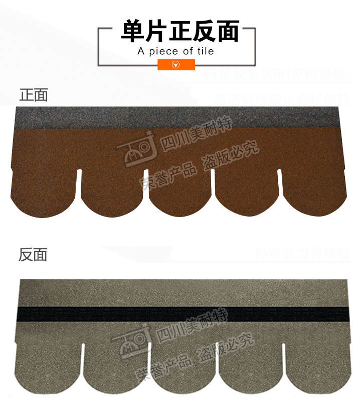 产品名称:鱼鳞型 产品规格:单层 产品颜色:棕褐色 长度(mm):1000mm±3 mm 包装:每包21片