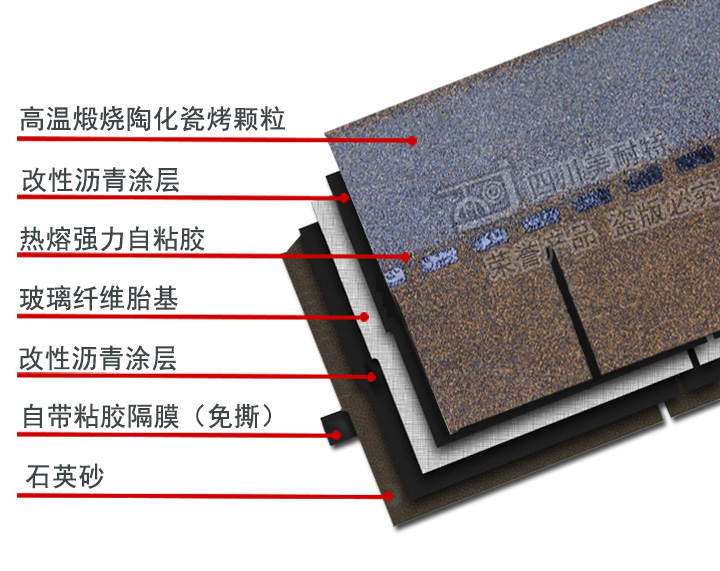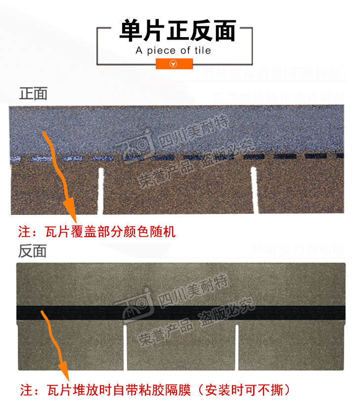 本款产品颜色丰富,立体感强,一般适用于广泛应用于高档别墅、高档小区、政府安置工程,学校工程等工程,产品可自由裁剪,能成功覆盖于不同形状和不同基层的屋顶。适用屋面坡度从15°到90°不同建筑。