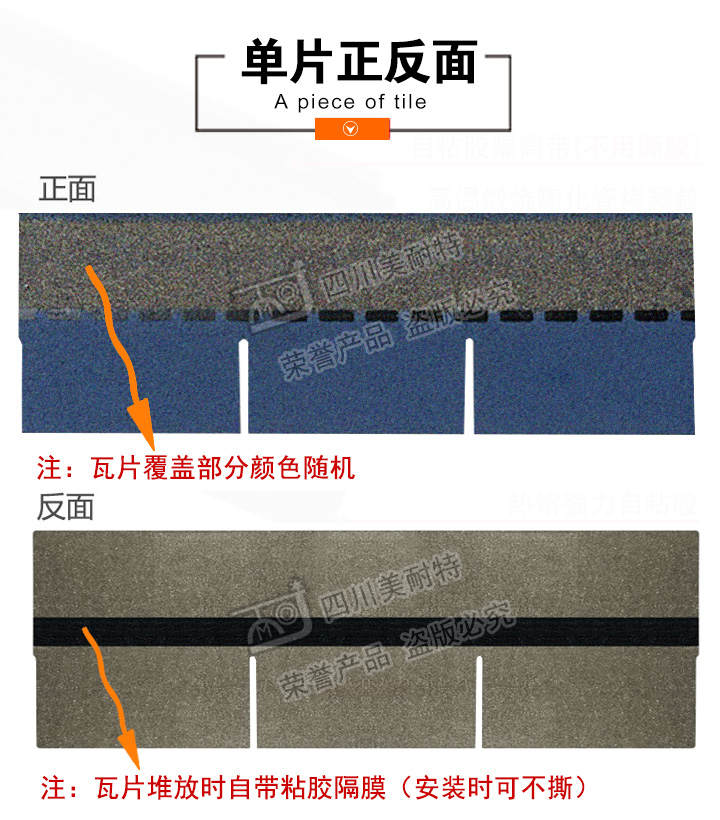 本款产品颜色丰富,立体感强,一般适用于广泛应用于高档别墅、高档小区、政府安置工程,学校工程等工程,产品可自由裁剪,能成功覆盖于不同形状和不同基层的屋顶。适用屋面坡度从15°到90°不同建筑。